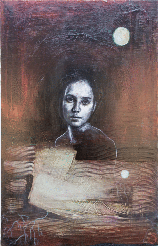 Ses compositions donnent à voir des figures féminines évanescentes, ancrées dans des univers fluctuants, entre rêve, réalité et paysage mental, explorant la dualité entre calme et chaos, entre figuration et abstraction. Elles sont un seuil, un pied dans le réel, puis une invitation à s’ouvrir sur ce qui nous entoure ; elles ne cherchent pas à représenter un individu mais à faire émerger une présence, une sensation, une introspection, et laisser rêver. Les éléments naturels deviennent aussi métaphores de nos états intérieurs, évoquant notre porosité au monde, la fragilité de notre être, et questionnant notre rapport au visible, au tangible.